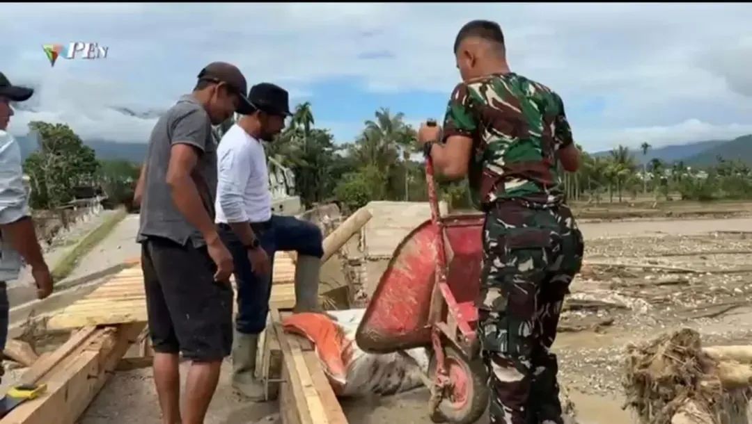 Personel TNI bersama masyarakat setempat bergotong royong membangun jembatan darurat untuk menggantikan jembatan utama yang rusak akibat bencana. Kerusakan tersebut sempat memutus jalur penghubung antarpermukiman dan menghambat mobilitas warga, termasuk distribusi logistik dan aktivitas ekonomi.
